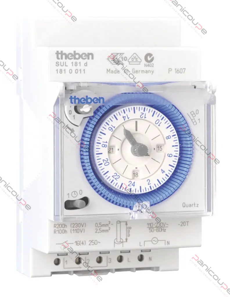 Horloges programmables analogiques. Programme journalier. 96 segments de commutation. Période minimale de commutation : 15 minutes. Aiguilles pour affichage de l’heure et détection 12h/24h. Correction simple de l’heure d’été/hiver. Correction de l’heure possible dans les 2 sens. Commutateur manuel à 3 positions : MARCHE/AUTO/ARRêt. Indication de l’état de commutation.Bornes à ressort. Montage sur rail DIN. 1 relais de sortie inverseur 16 A/250 V. Alimentation 230 Vac 50 Hz. Boîtier 53,6 x 128,2 x 65,6 mm Dimensions normalisées rail DIN : 3 modules.